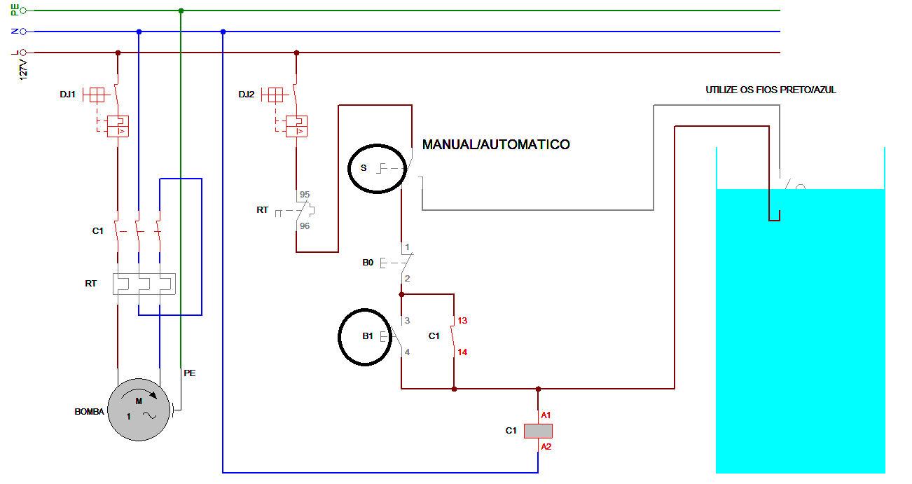 No exemplo utilizamos tensão 127V fase/neutro então quando a boia descer fechará o contato e acionará a boma desde que a chave seletora esteja na posição automática.